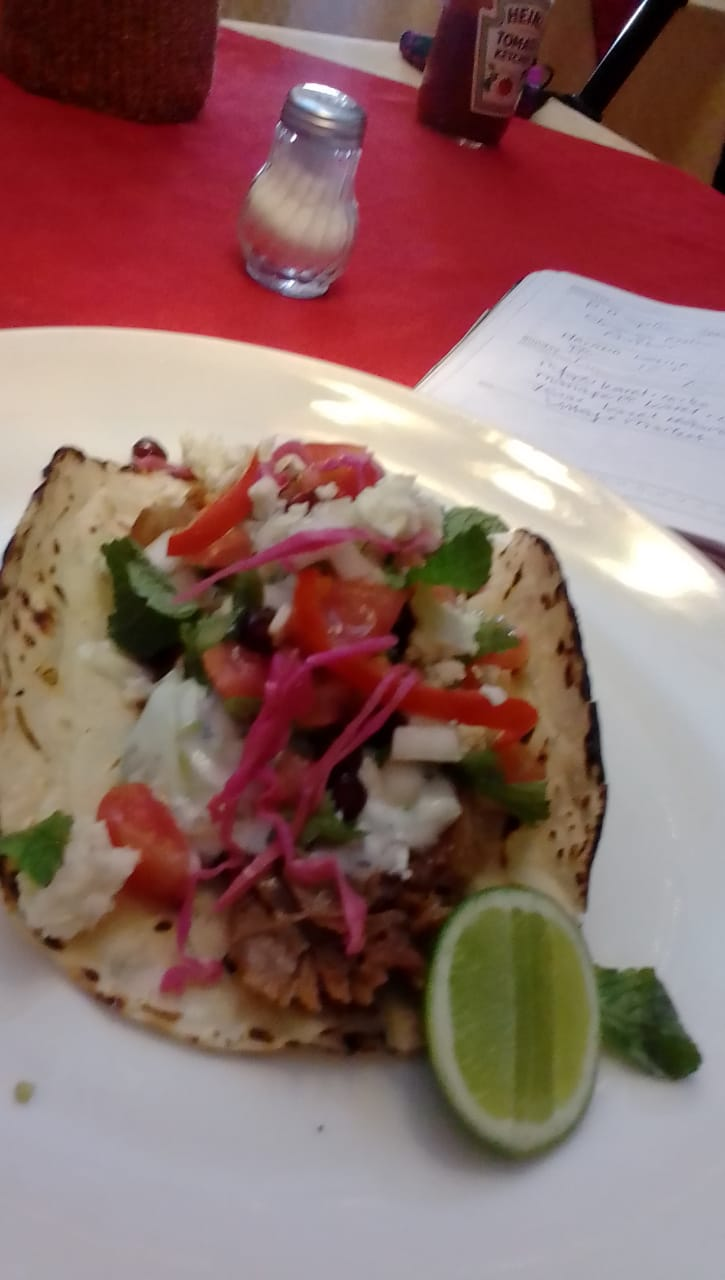 Next came a full taco of slow-cooked pulled lamb with home-made feta cheese, pickled red cabbage julienne, fresh cucumber tomatoes and onions, mint leaves and of all things, pomegranate seeds. I tenderly wrapped this curious wonder and tried to fit it in my mouth as elegantly as possible. Until the taste hit my tongue. Then I abandoned all pretense of table manners and as Bart Simpson says, commenced shoveling. I was shocked for two reasons: one I really don’t like lamb at all usually but this was something else entirely, and two, the pomegranates acted like they were meant to be there all along. Add a dash or two of tabasco sauce and the whole thing came together like hot butter on good toast.