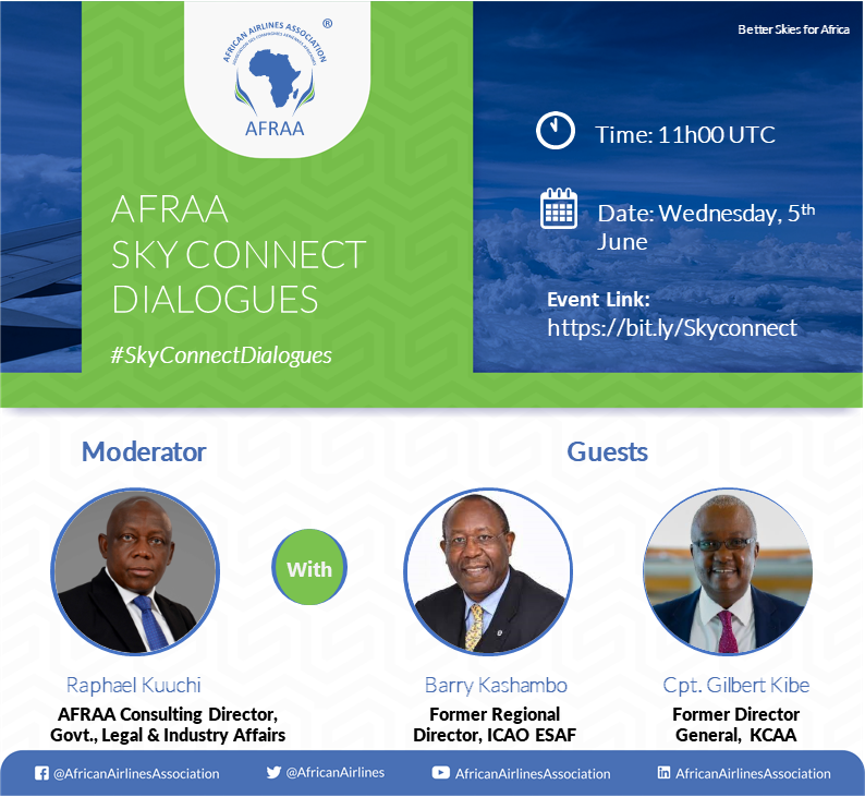 Mr. Barry Kashambo, Former Regional Director, ICAO ESAF and Cpt. Gilbert Kibe, Former Director General, Kenya Civil Aviation Authority take centre stage at the June edition of AFRAA SkyConnect Leadership Dialogues session scheduled for Wednesday, 05 June at 14h00 EAT (UTC: 11h00).