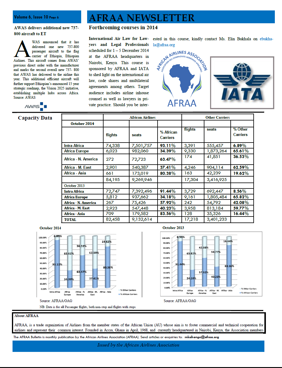 For all the aviation buffs among my readership here is the latest AFRAA newsletter with lots of details otherwise difficult to come by. Most notably does AFRAA share some of the latest statistics about capacity comparison between African and foreign airlines, another pointer how onesided the battle of the skies is getting in favour of non African carriers o nkey routes to Europe and the Middle East. Enjoy reading!