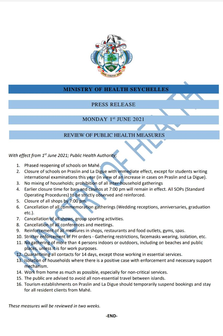 Following guidelines received from the Seychelles Ministry of Health and as per the Seychelles Travel Advisory issued by the Ministry of Foreign Affairs and Tourism on 01st of June 2021, the reintroduction of restrictions have been imposed on travelling between South Africa and the Seychelles.