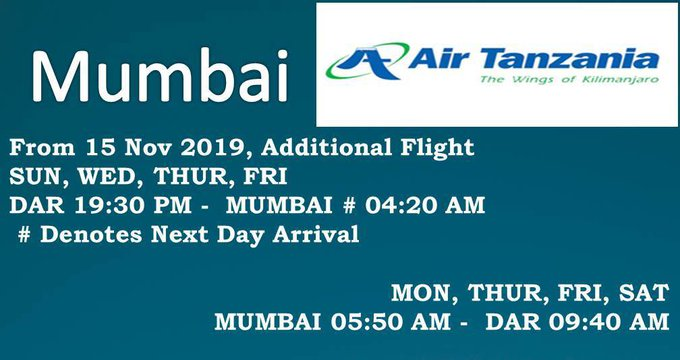 It is understood that effective 15th of November a fourth weekly flight will be added to the schedule, which will then offer departures from Tanzania’s commercial capital on Sunday, Wednesday, Thursday and Friday. The return flights from Mumbai will leave the Indian city on Monday, Thursday, Friday and Saturday.