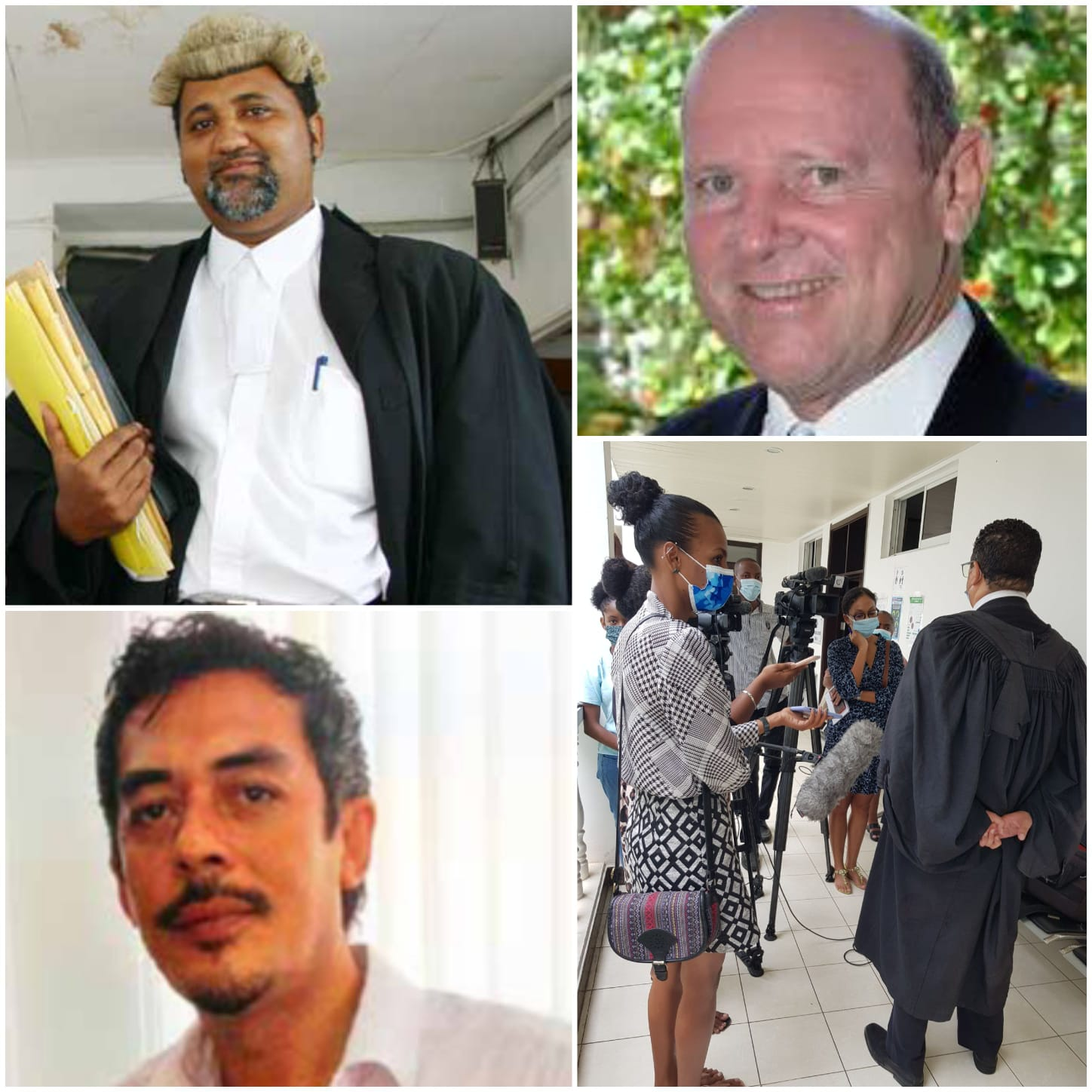 Photo caption: Frank Elizabeth and his client Alain St.Ange and Alexander Pierre and his lawyer Basil Hoareau addressing the gathered press at the Court House