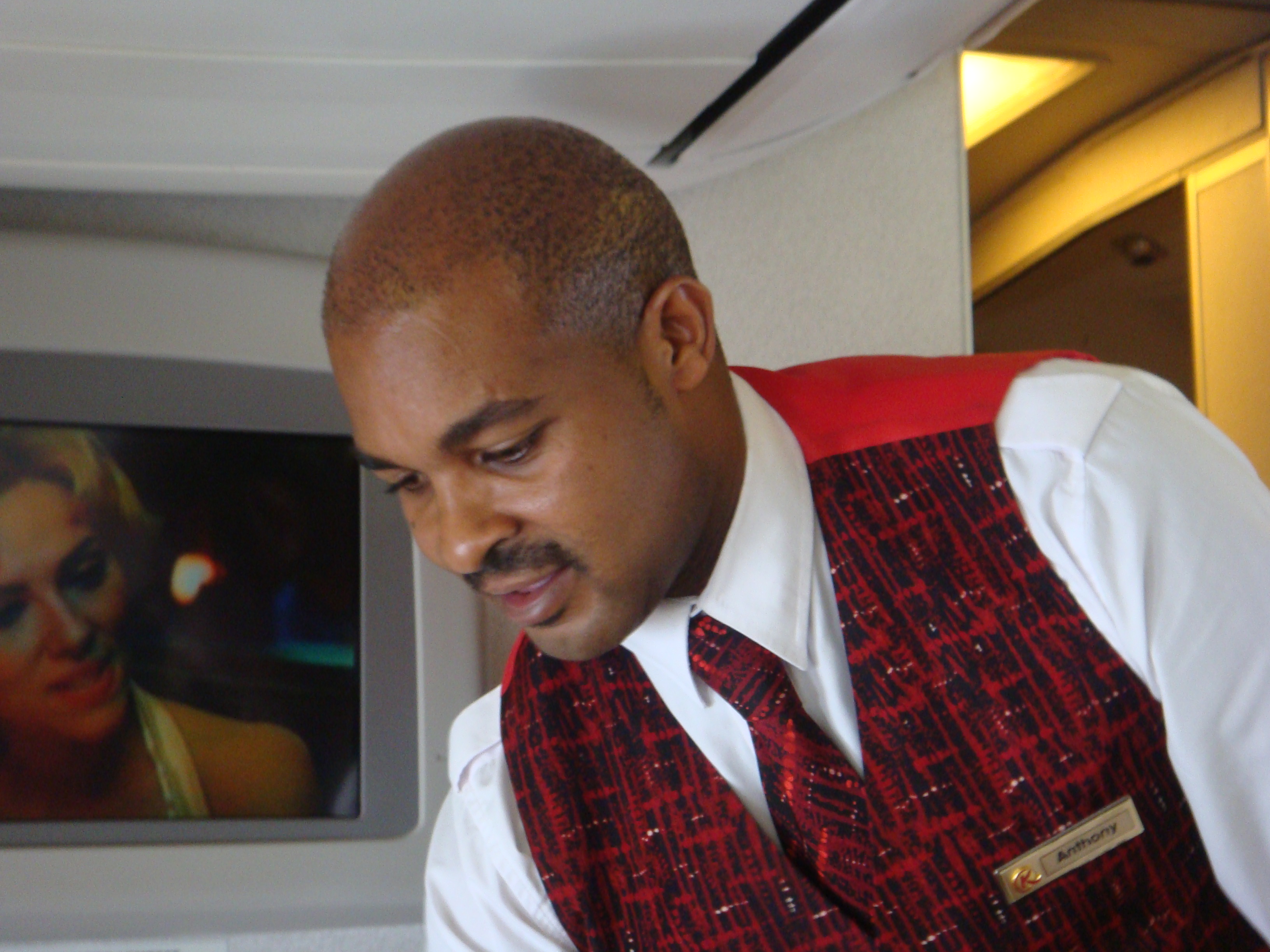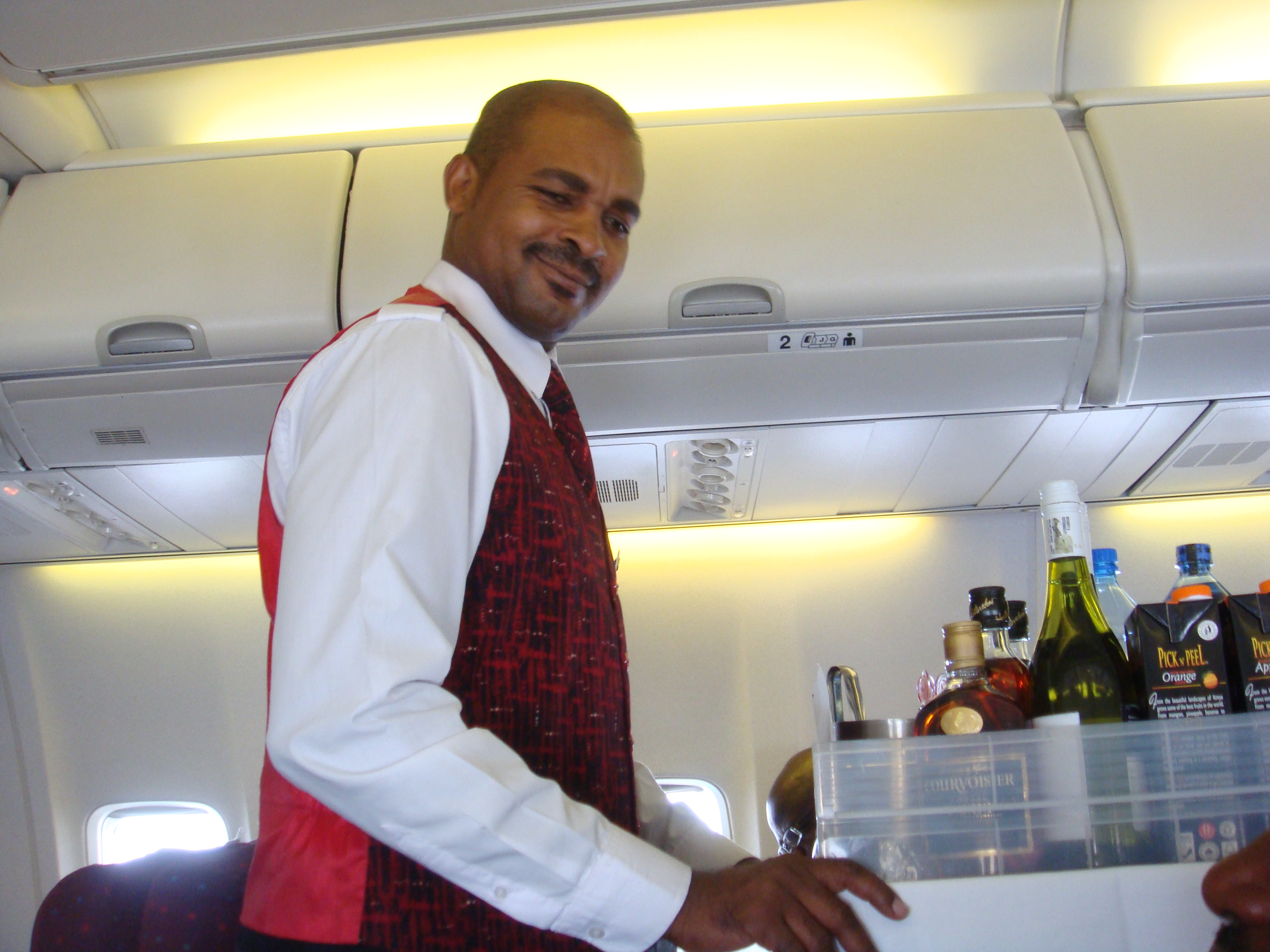 (Flight purser Anthony Gakuru doing his thing on the B737-700NG operating on this flight KQ250 from Nairobi to Mahe)