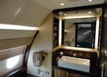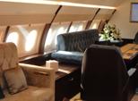 (The interior of a private corporate jet on the platform of an A320, sitting room, bedroom convertible to a private office, an elaborate bathroom with shower-cabin and the First Class section behind which is an economy class section for such staff not having the ranking yet to sit up front.)