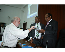 Mike Chambers BHR Director handing a PSAPI document to the TPSF chairman Reginald Mengi (right) and the Minister for Natural Resources and Tourism (center) Prof Jumanne Maghembe