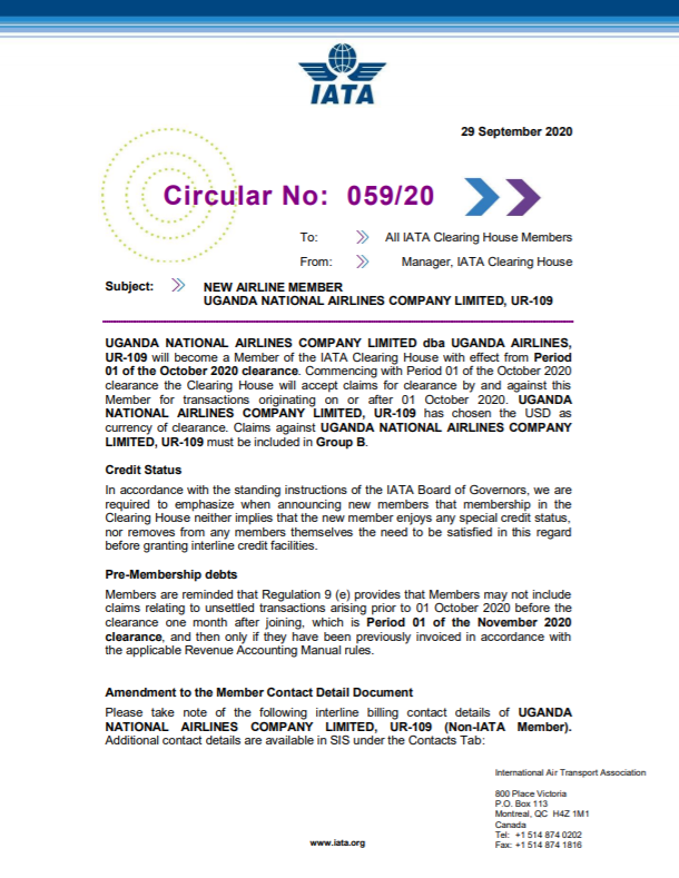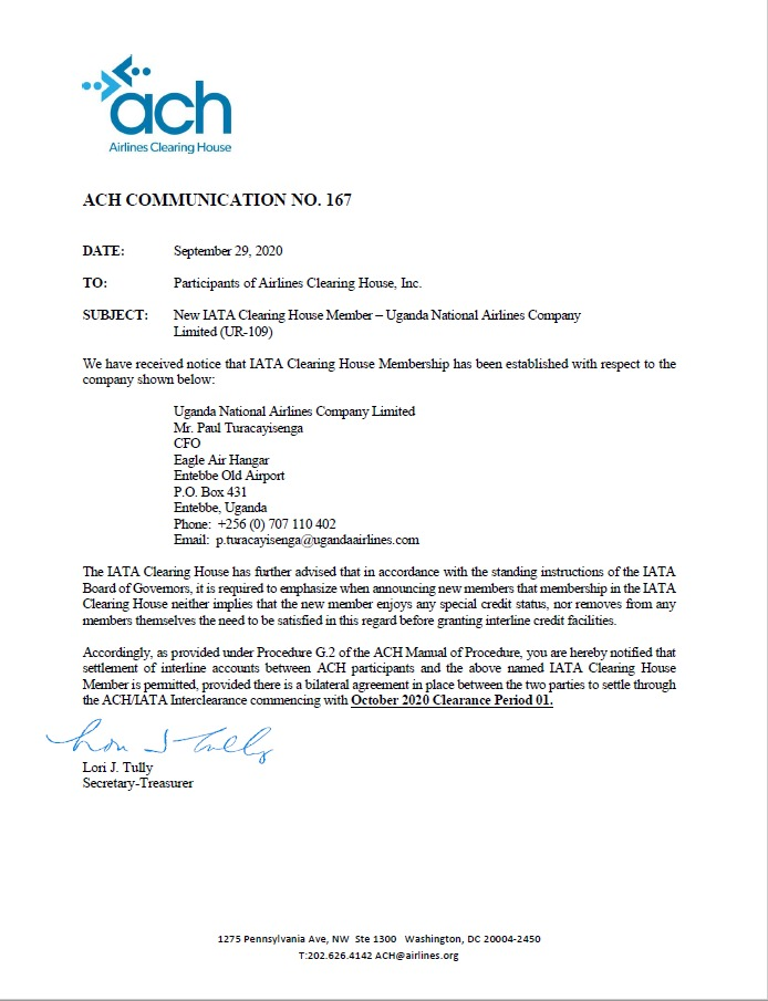 ATCNews has received confirmation that Uganda Airlines has, effective 01st of October – the day when scheduled passenger flight operations resume – been admitted to the airline clearing house, in short ACH.