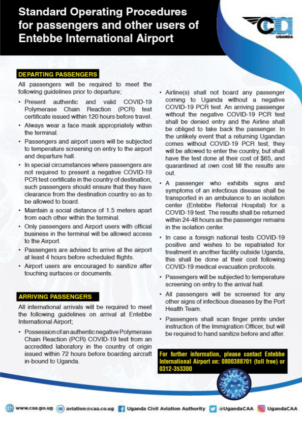 Ahead of the launch of scheduled passenger flights into and out of Entebbe has the Uganda CAA also once again reiterated their now applicable standard operating procedures, giving guidance to passengers what is expected of them in regard of compliance with the new health and safety operations.