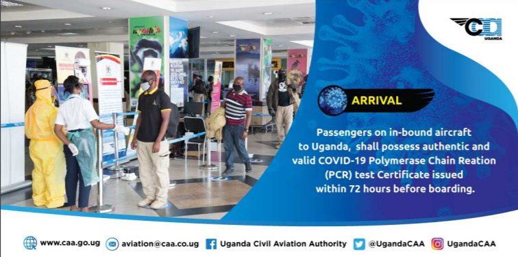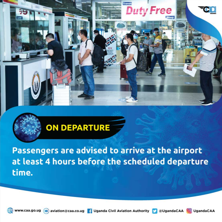Airlines and the Uganda CAA recommend for passengers to be at the airport at least four hours ahead of their scheduled departure to allow for enough time to clear all the various security, health and safety checkpoints and be able, in case of any unforeseen developments, to still be able to resolve challenges which might otherwise prevent a traveler from boarding their flight.
