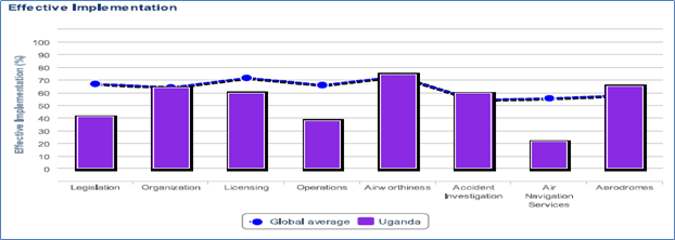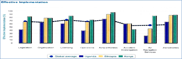 It is clear from these statistics that Uganda failed to meet not only global standards but also those of key neighbouring countries in the areas of legislation, licensing, operations and air navigation services, the latter showing the widest compliance gap.