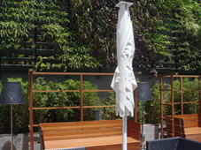 The same bright colours also impress on the ground floor where a small lobby lounge allows for some informal meetings while the adjoining bar, the indoor and outdoor terrace restaurant – in part under a translucent roof – gives guests that contemporary feeling, further underscored by the unconventional uniforms for the staff, again set alight by colours rather than the ‘regular‘ dull grey or black suits.