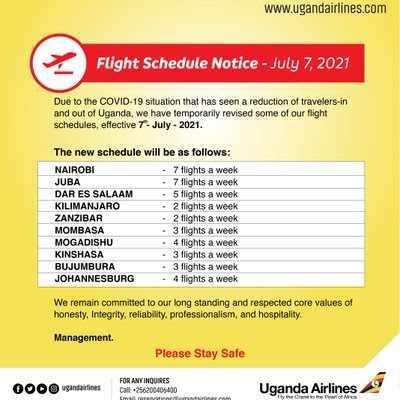 Uganda Airlines, hard hit by the current wave of new COVID19 infections as all other airlines flying to and from Entebbe, has earlier today reiterated that flights to all current destinations will continue, albeit at reduced frequencies.