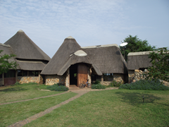 (Main building and cottages, all with thatched roofs made of grass from the area)