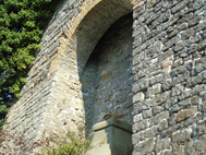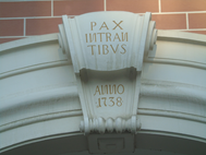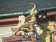 (The famous ‘Damian’s Gate or Damianstor’ which is part of the palace’s outbuildings and next to it one of the intricate works displayed at the front of the palace, on the left the Coat of Arms of the City of Bruchsal. Also shown is one of the ‘dragons’ which adorn the entire roof)