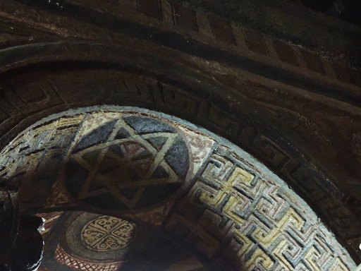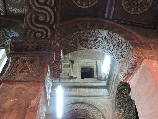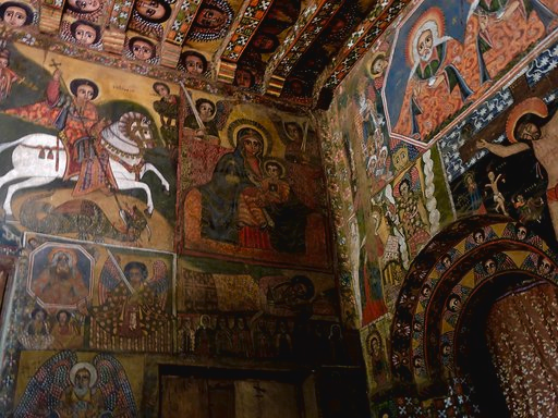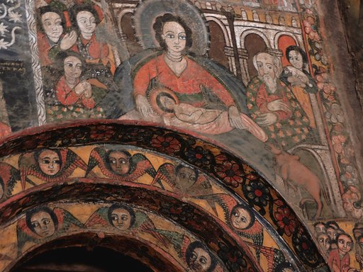 Narga Selassie on Deq Island also has a wonderful array of wall paintings with devils leering, saints suffering and Bible stories aplenty. The Virgin Mary, revered as a saint in the Ethiopian Orthodox Church, comes to the forefront at around this time, with numerous depictions of her being crowned and feted; Ethiopian saints, too, start making an appearance in the paintings of this century. Dating to a similar time, Debre Berhan Selassie in nearby Gondar not only has walls filled with paintings but boasts a roof swathed in winged angels.