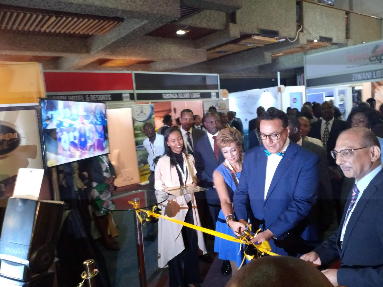 (Go Places owners Nev and Mansoor Jivani welcome Kenya’s Cabinet Secretary for Tourism and Wildlife Hon. Najib Balala to their stand for the official tape cutting)