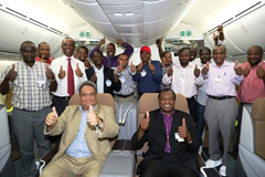 (Seen here, courtesy of Kenya Airways, senior staff from the airline and the Kenya Civil Aviation Authority on board of the aircraft with Director Flight Operations Capt. Mwangi and two of the cabin crew at the hand over dinner in Charleston)