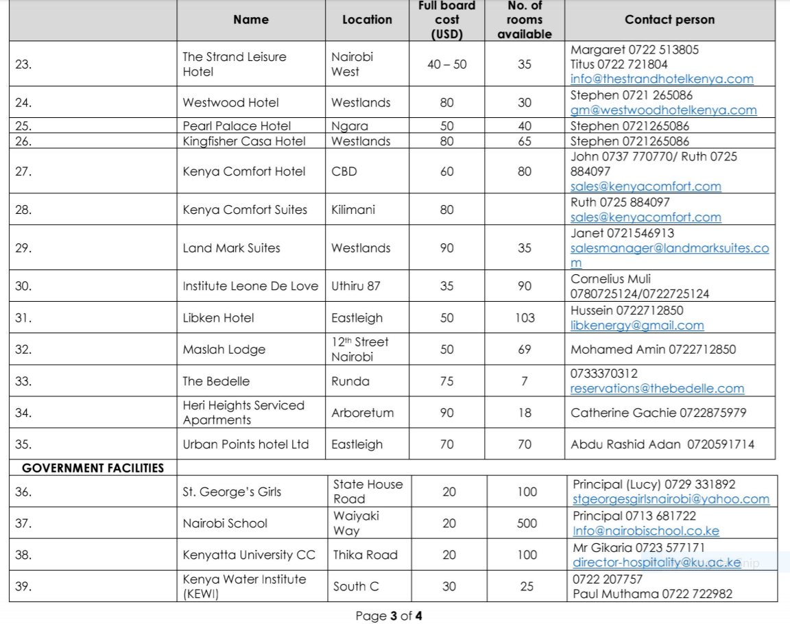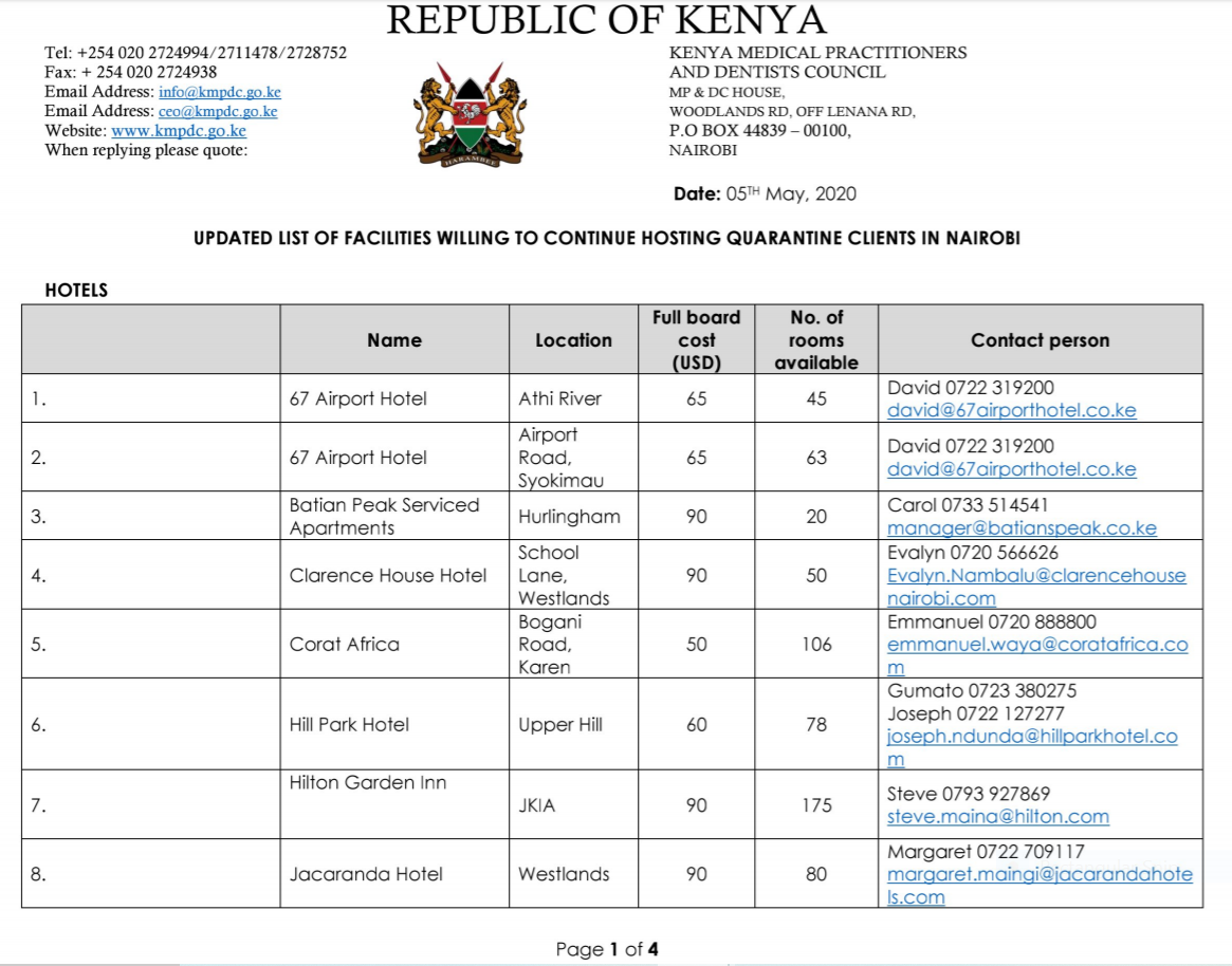 NEW LIST PROVIDES INFORMATION ABOUT APPROVED QUARANTINE HOTELS IN KENYA