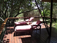 The tents are generously spread about the compound, some surely 50 or more metres apart from the next and those closer together still giving ample room for privacy and all are standing tall on elevated platforms from where, to varying degrees, the Ntiaktiak river can be seen and where at night the hippos can be heard as they snort, or else crunch as they wander about grazing between the tents. The tents’ furnishings, including sunbeds on the large verandah, were ticking all the right boxes and an armchair WITH footrest stood strategically placed to look out from either behind the glass doors or at least during the day, through the open doors, giving some cool shade when the outside temperatures rise into the mid thirty Celsius range and even higher.