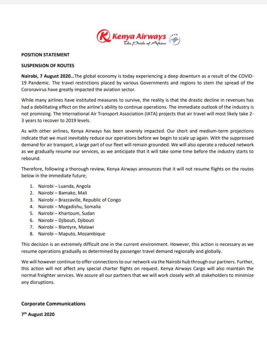 Citing lack of demand and pointing to the global economic downturn as a result of the #COVID19 pandemic has Kenya Airways announced that initially 8 routes will not see connections restored after the airline began international passenger flights again on the 01st of August.