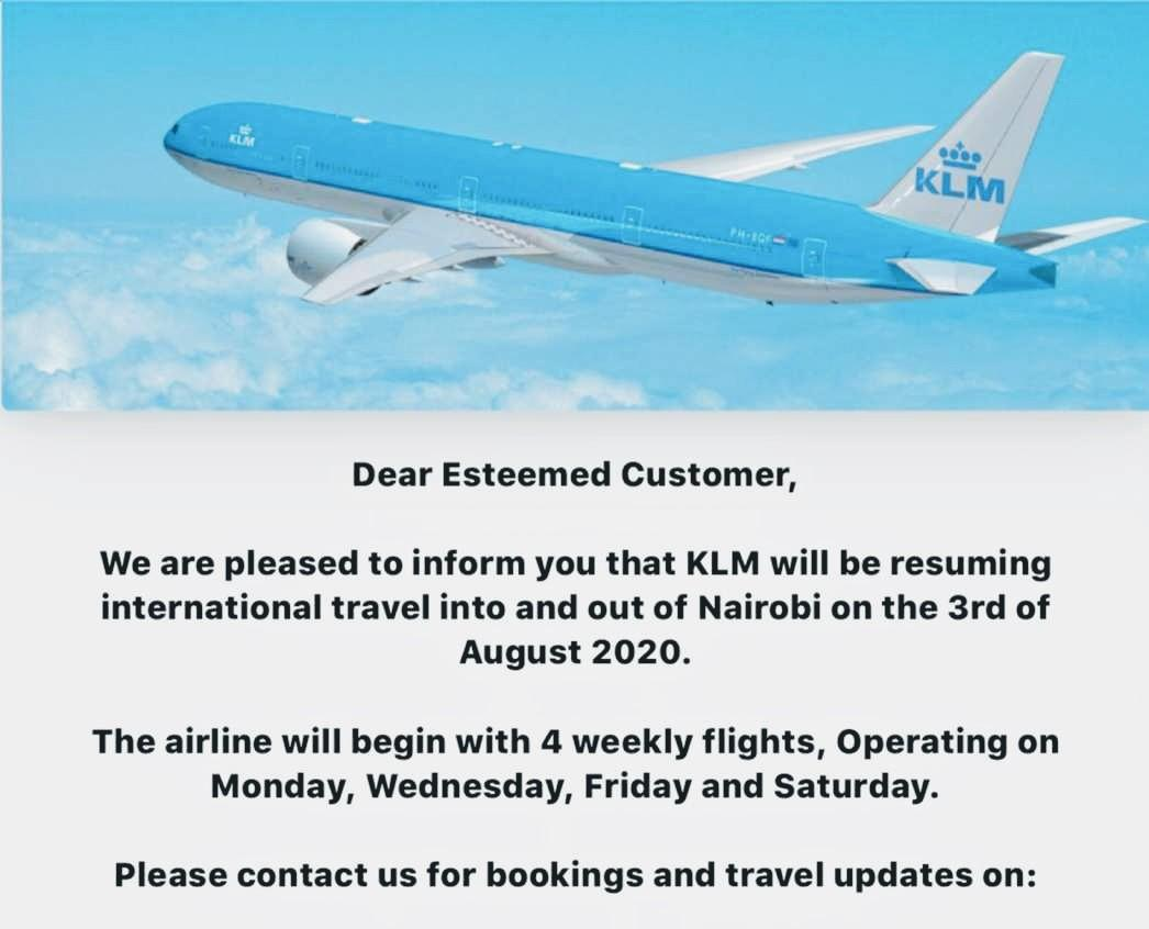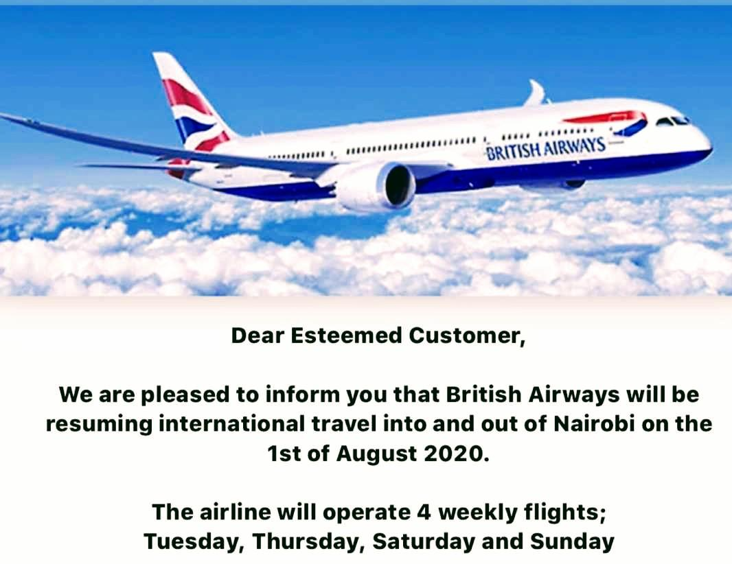 The announcement of the opening of Jomo Kenyatta International Airport in Nairobi – and of Moi International Airport in Mombasa – for scheduled passenger flights has brought instant results as both British Airways and KLM, two major international airlines, have announced their return to Kenya on the 01st of August and 03rd of August respectively.