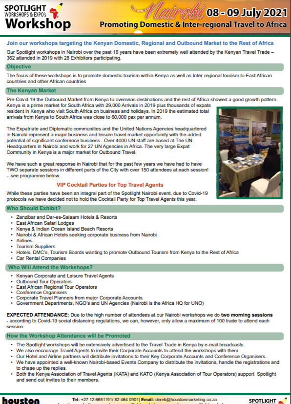 The breaking news on the lifting of Lockdown restrictions for Nairobi will give East African inter-regional travel a great boost and Spotlight Nairobi on 08 & 09 July will be an ideal platform for East African suppliers to promote to Nairobi agents and tour operators.