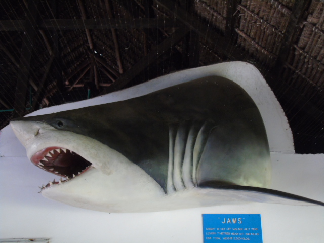 (The head of a 2.5 ton heavy and 7 metre long shark mounted at the Malindi Sea Fishing Club and one of the club’s boats, available for hire with a full crew)