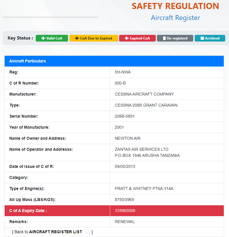 According to the TCAA aircraft register is the plane registered under the name of Zantas Air Services LTD, of P.O.Box 1946 in Arusha / Tanzania, entered service first in 2001 and was registered in Tanzania in 2013.