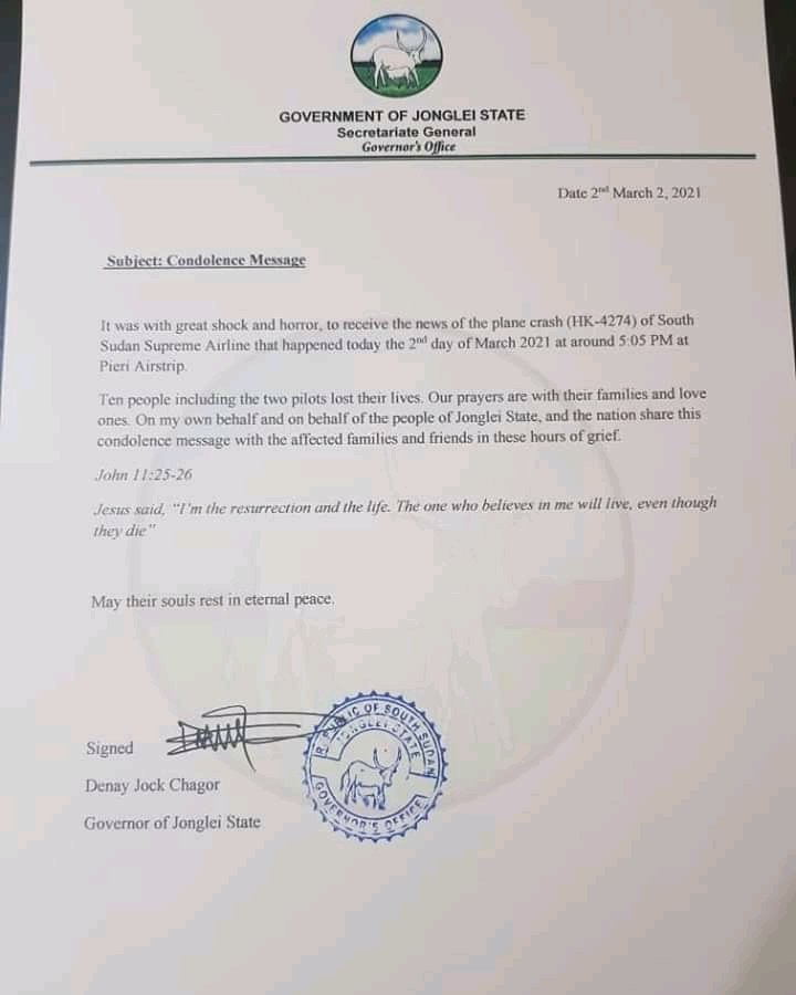A South Sudan Supreme Airlines LET 410 crashed 24 hours ago shortly after take off with 8 passengers and 2 crew on board near the Pieri airstrip. The flight was destined for the Yuai airstrip. None of those on board survived the crash.