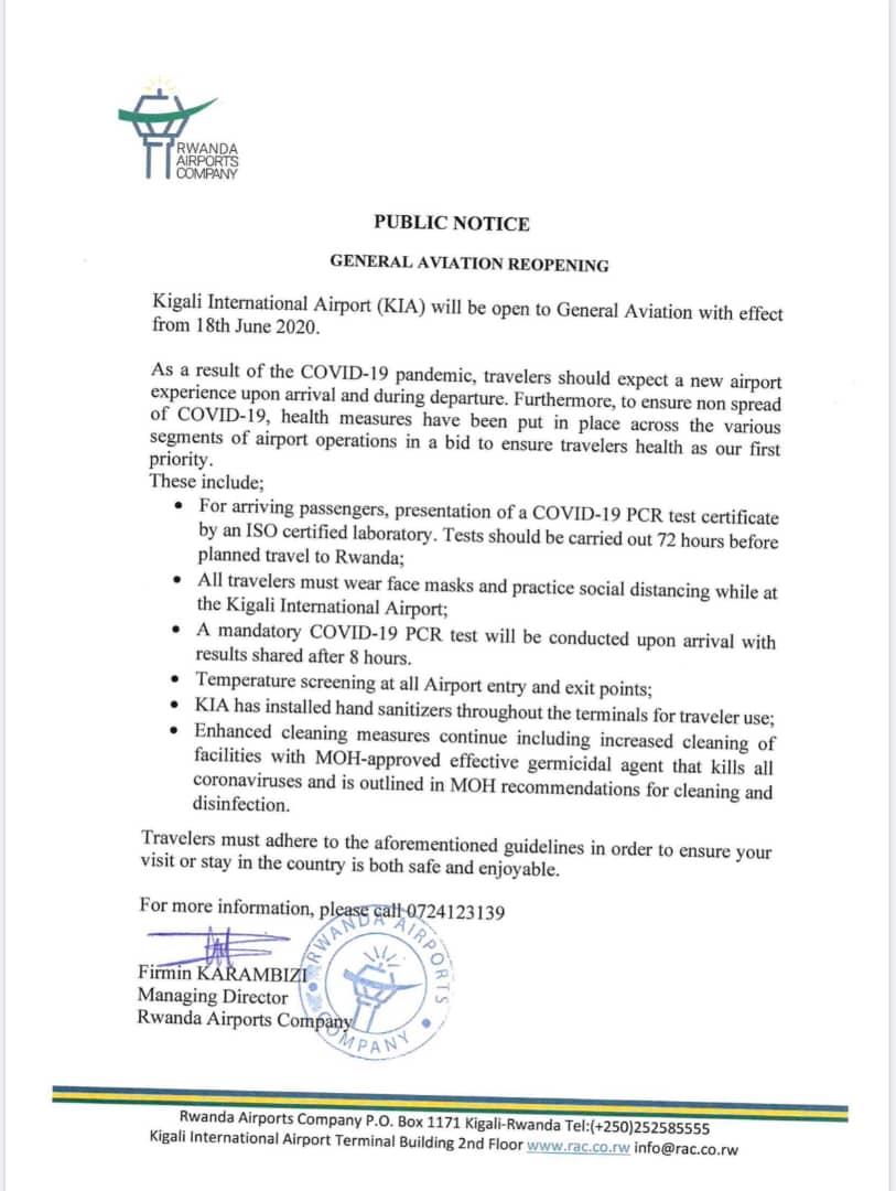 Information is awaited from Rwanda when mainstream passenger services will reopen at the airport and it is anticipated that similar measures like outlined in the RAC letter will then apply.