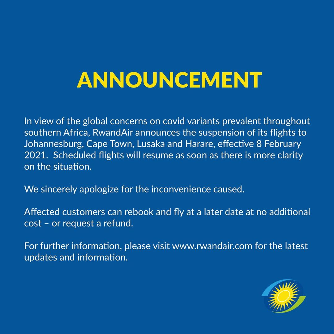 RwandAir has confirmed the suspension of their flights from Kigali to Cape Town, Johannesburg, Harare and Lusaka, effective today, 08th February 2021.