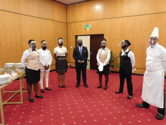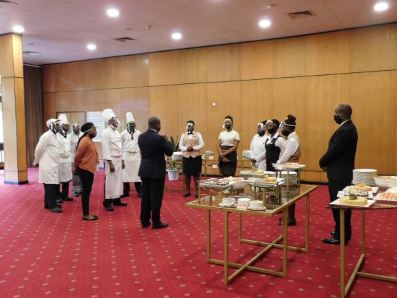 (Staff assigned to the function are being briefed before some key members line up for a group picture with Director of Food and Beverages Mr. James Odenyo in the middle and Executive Chef Eshton Muthai on the very right – none of them very recognizable behind masks and shields)
