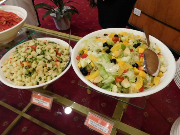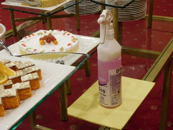 Serving spoons, tongs and other utensils are regularly exchanged and sanitized before use to ensure a hygienic environment. All chafing dishes were wiped down before the food trays were inserted and once again just before they were opened, ready for the lunch service. A similar regime was put into place at the salad bar and the dessert tables.