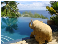 The bedrooms, furnished with a tasteful blend of hand crafted cabinets, desks and chests, matching carpets, pictures, pieces of craft and collector’s items, leave nothing wanting and neither do the well appointed bathrooms or the walk in wardrobes. The master bedroom suite has 5 doors opening to the upper floor terrace, which runs along the length of the house and which, especially in the morning at dawn, but also in the bright sunlit colours of the early afternoon, often left me rooted to a spot, gazing over the ocean while the surf from far below provided the background beat to supplement the ever present birdsong. Those ‘French’ doors, like almost every other item used in creating this bespoke home, have a history as the owners brought them from India while the flooring is made of re-used Burma teak. The colonial windows, as I thought on first sight, were brought in from Kenya while much of the metal work, including the spiral staircase leading to a study above the bedroom, was also imported from India and Burma, where Karl Ammann found these treasures and brought them to the Seychelles. Other furniture must have been collected across Eastern Africa and notably are elephant statues, pictures and wall decorations visible everywhere, testament to the owner’s work as a renowned wildlife photographer and keen conservationist.