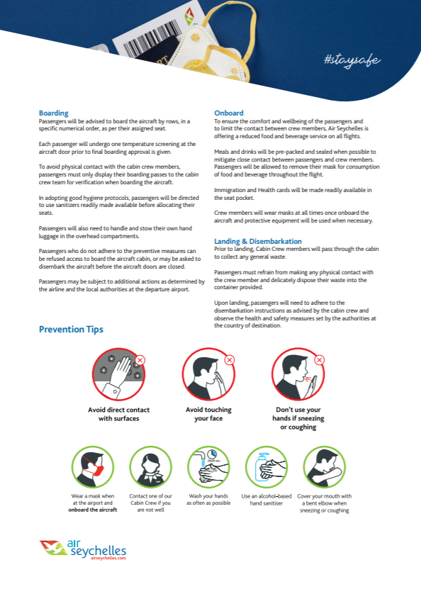 The new guideline communicating about the health and safety procedures to be followed during check-in, boarding, in-flight and upon disembarkation, also reiterates the mandatory requirement of wearing masks on all Air Seychelles flights.