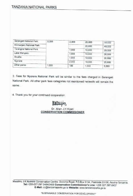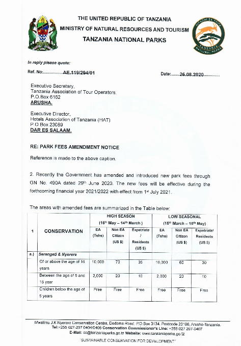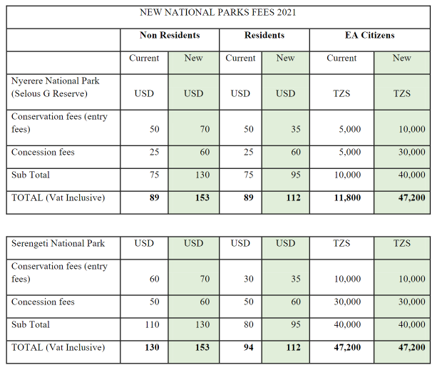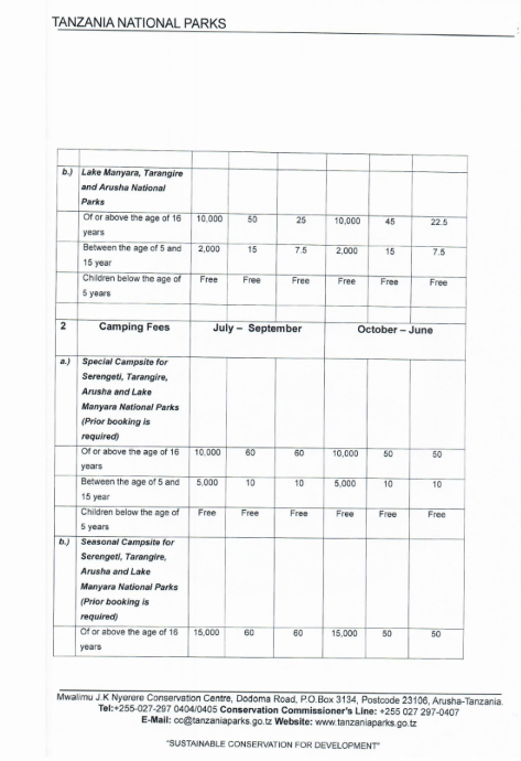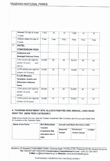 The new fee structure is published above and below and intending travelers and tour agencies should consult with their hotel groups and safari operators in Tanzania what impact this will have on already quoted prices for safaris.