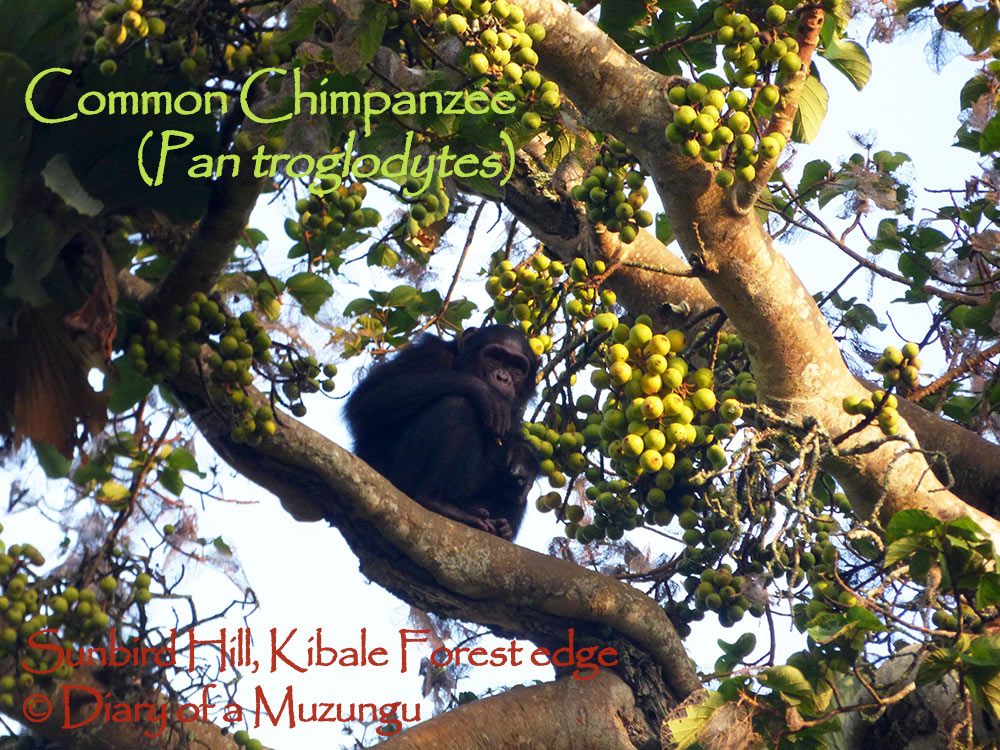 Today has been the hottest day for weeks and an exciting one too. Early morning sunshine drew my eye to the top of the fig tree where an excited group of chimpanzees announced that the figs are ripe!
