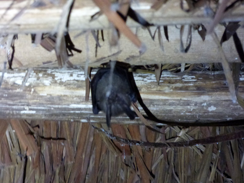 I was quietly reading when I heard the tell-tale batwing noises below the thatch. I slowly moved the torch in the direction of the ceiling where I spied the animal dangling upside down, right above me. Staring in my direction was a dark little face with small eyes and big long ears – like a rabbit!