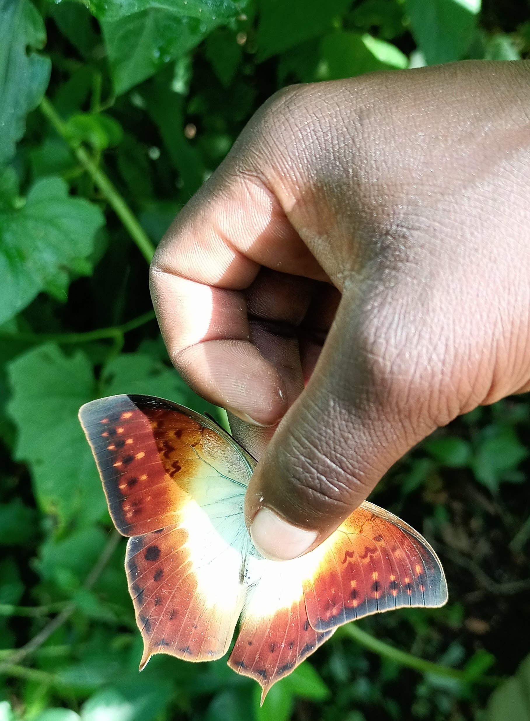 The team pauses to identify butterflies, such as the strident Forest Pearl Charaxes. An electric blue-coloured damselfly buzzes past. Robert explains the difference between dragonflies and damselflies: a damselfly folds its wings behind its body: its wings are shorter than its abdomen and its eyes are far apart.