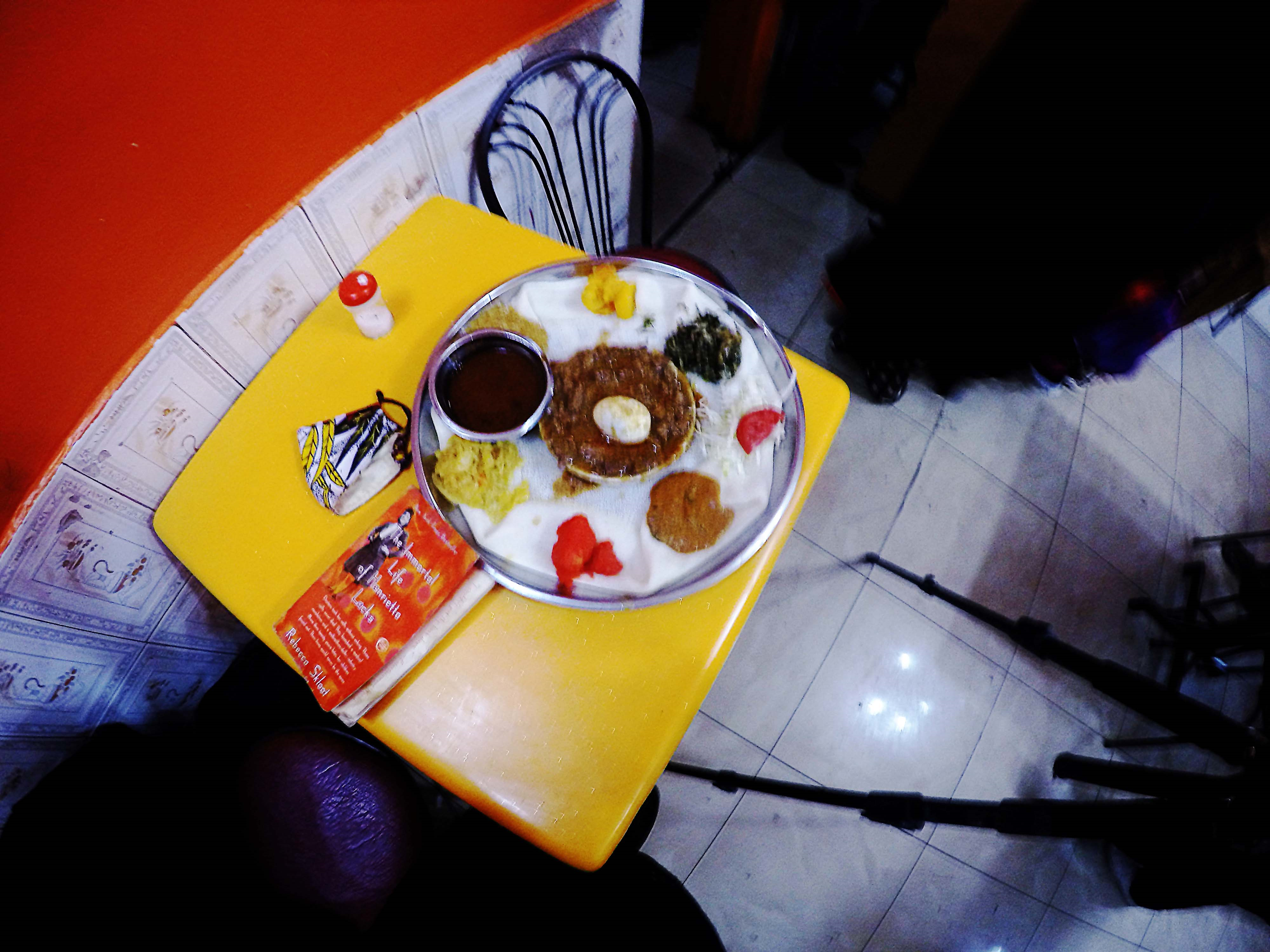 Onwards and upwards, and I find a tiny gap in the street with the aid of a helpful boda motorcyclist and my very sensitive nose, just when I was about to give up and go home. I entered a pleasant little café called BIG MAC, where fully robed and semi-veiled ladies sat chatting and sharing glistening trays of enjera and assorted condiments and sauces. The pink and tangerine walls were reflected by large mirrors with arabesques printed frames, and a TV quietly whispered a telenovela overhead by the entrance. A handsome Ethiopian gentleman beckoned me to sit down and happily allowed me to film.