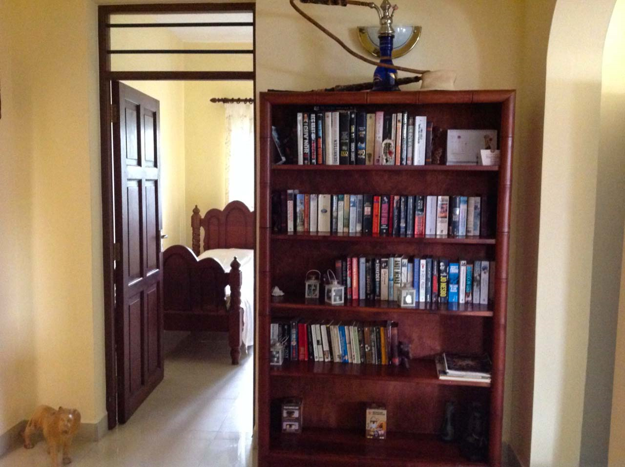 Arranged around a multitiered oblong swimming pool reminiscent of a turtle popping it’s head out of its shell, the 7 four-bedroom villas and 4 two-bedroom apartments are fully fitted with what a person could want because they are individually owned and rented out to you when the owner is not using them. As such you will find all the variables of a lived-in house, including bookshelves and sculptures, well-loved twin beds for the children and a lovely four-poster in the upstairs Master bed for Mum.
