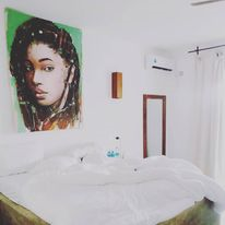 Dignified by contrasting African majesty with European props, each photographic portrait is endowed with a sense of revisionist history, placing the African in the global context of history. The painted portraits of the dreadlocked maiden in my room and of other Masai bejeweled youth in the upstairs bedrooms were done by Dominico Di Genni, who used to live in Kenya and now lives in Italy with his Kenyan family.