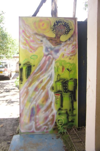 Among the teachers was a local reggae music band called W.O.T.E. (WARRIORS OF THE EAST), started by a one of the most conscious Rastas I have had the pleasure of meeting outside the Anglo/Caribbean Rastafarii Movement, and incorporating a genuine Masaaii Warrior who wails like any good Rock singer would. “Some think we will never make it but we know that we will”; that is the slogan that this band preaches, their base camp high on the East side of the mountain as a backdrop, on a plateau that is magical in its clear aired green-grass carpet energy. We sat in a circle as mentors and laid ourselves bare to each other. Nairobi’s best spray-painter, graffiti artist extraordinaire Douglas “SMOKILLAH” Kihiko made himself available, equally responding to the Batman call of artistic altruism that is a prerequisite of Pan African re-education of the “youngins”.