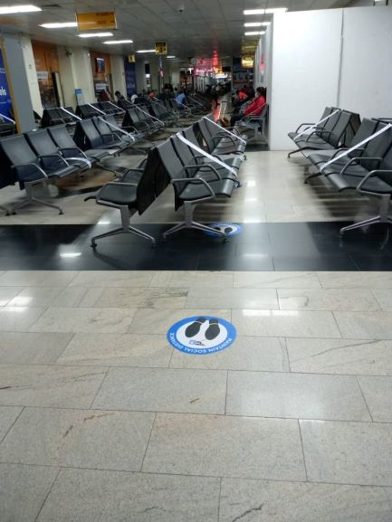 (The remodelled main departure waiting area ensuring physical distancing with signs on the floor and spacing on the seats – also seen here is a traveler whose outfit reminded me of the proverbial overkill)