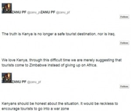 Kenyan government officials and tourism industry representatives are said to be in a pensive mood over twitter comments allegedly made on Zimbabwe’s ruling party twitter handle. Kenya is reportedly seeking an official clarification from Zimbabwe, should the account be found to belong to ZANU PF while initial comments, all made off the record, speak of frustration, as Kenya stood by Zimbabwe during the times of full boycott and denounced actions by Western countries at the time aimed to prevent tourists from going to that country.