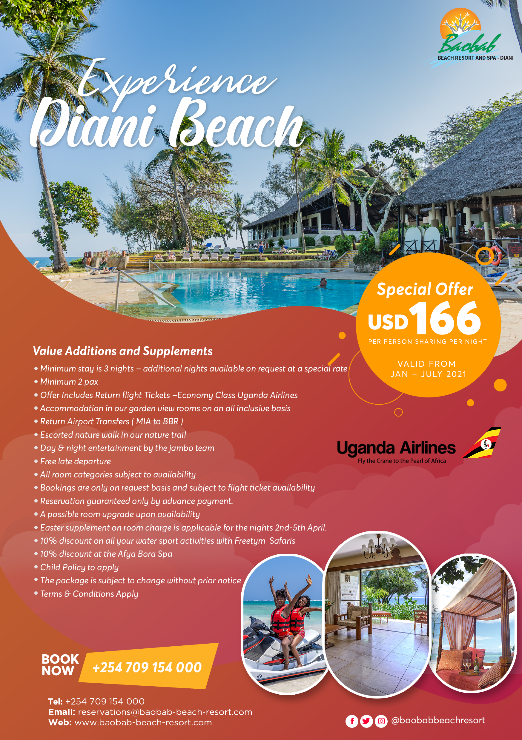 Africa’s best family resort – according to TripAdvisor rankings in 2020 – the Baobab Beach Resort, has partnered with Uganda Airlines to bring one of the world’s greatest beaches, Diani Beach, closer to Ugandans searching for a break at the seaside.