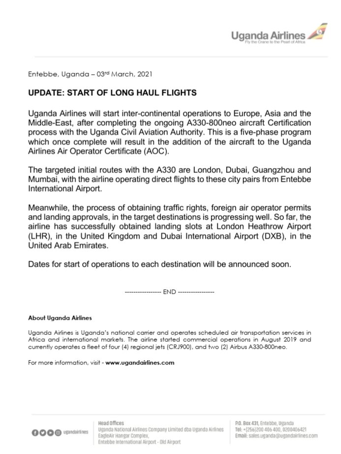 Following a number of negative media reports about the launch of long haul destinations has Uganda Airlines given details about the ongoing certification process of the new Airbus A330-800Neo aircraft.Usually well informed aviation sources in Entebbe have suggested to ATCNews that it might be the Uganda Civil Aviation Authority which is responsible for the delay, following a very slow process of certification which was expected to be complete when the first Airbus arrived before Christmas last year.