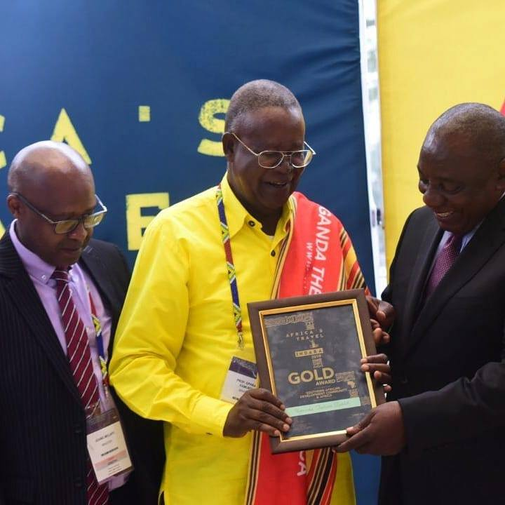 (Outgoing Hon. Kamuntu on the left and incoming Hon. Butime on the right. Hon. Kamuntu is seen receiving the trophy for best stand at the 2019 edition of Indaba from South Africa’s Presiden Cyril Ramaphosa)