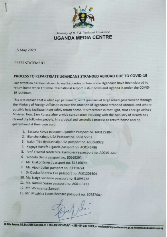 It is understood that besides the 13 named in the letter shown above, a very large number of Ugandans are still marooned abroad, including many students in China, where in particular Africans were subjected to abuse and racism as widely reported on regular and social media at the time.