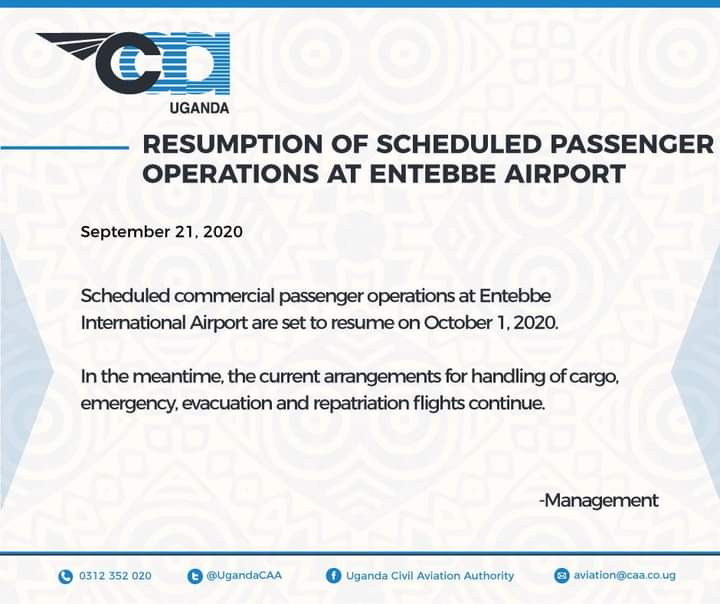 UGANDA CAA ANNOUNCES AIRPORT REOPENING FOR 01ST OF OCTOBER AFTER EARLIER PRESIDENTIAL ADDRESS MADE NO MENTION OF DATE