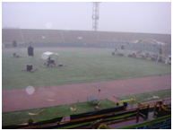 And then mother nature struck, and struck hard, as the approaching dark clouds suddenly seemed to accelerate as if rushing to reach the stadium, then staying put above and starting to unleash a cargo of heavy rain and hail alongside gale force winds. Everyone who could from the stands scrambled to safety of indoors, others hid under the stages on the pitch while others yet rushed up the VIP stand hoping for a dry spot but were still soaked when the storm blew the rain horizontally around the stadium ring, lashing all and sundry still out with rain drops and small fingertip sized hailcorns.